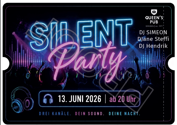 Vorankündigung: Die erste Silent Party in Dingden gibt's im Pub am 13.06. DJ Simeon, Dj Hendrik und DJane Steffi sind am Start und legen gleichzeitig auf drei Kanälen auf. Sei dabei und buch dir deinen Kopfhörer. 10 Euro pro Kopfhörer, Vormerkung und später auch die Tickets bei Bosch Wensing. Frag nach Elke.