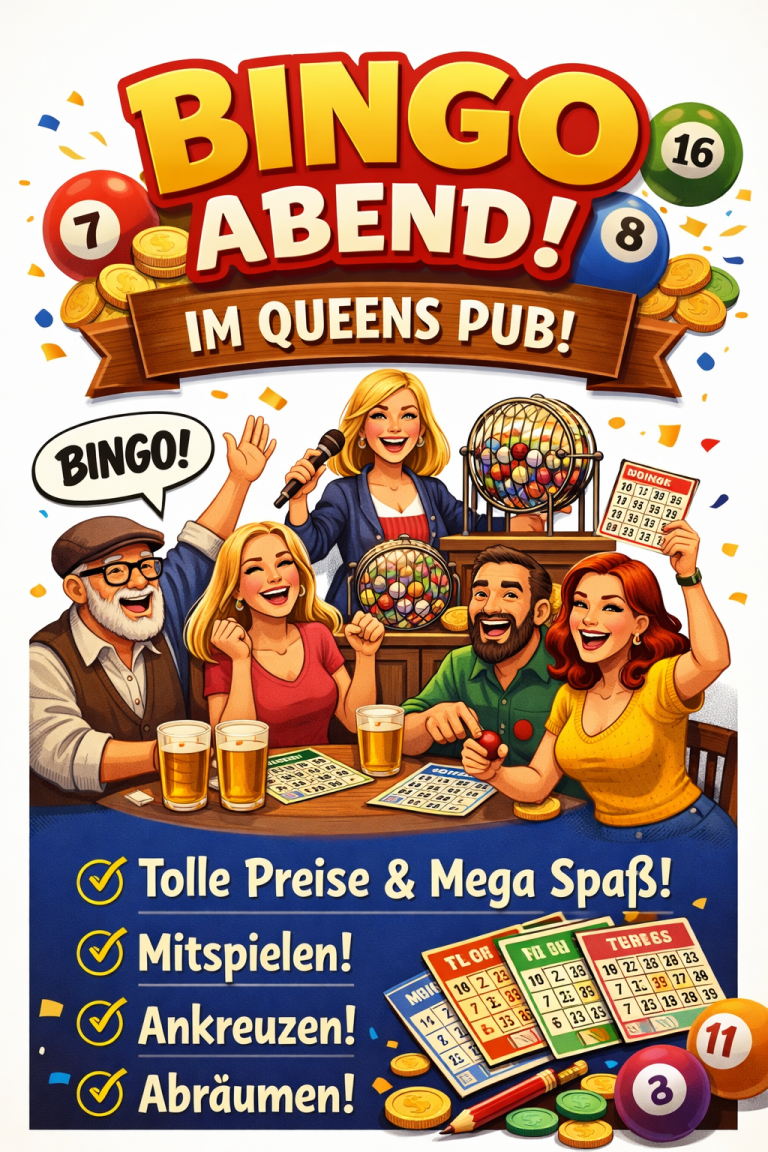 Am 23. April ist die Bingo-Frau Vanessa wieder da. Die 4. Bingo Night im Pub. Die etwas andere Spaßveranstaltung. Mitspielen und Abräumen, oder einfach nur mit Freunden quatschen und ganz nebenbei den Jackpot abräumen. So kann man den Donnerstag gemütlich ausrollen lassen.